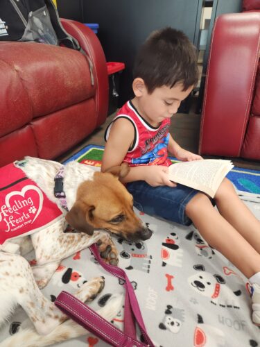Estudiantes leyendo con Reese, el perro de terapia de Brady.