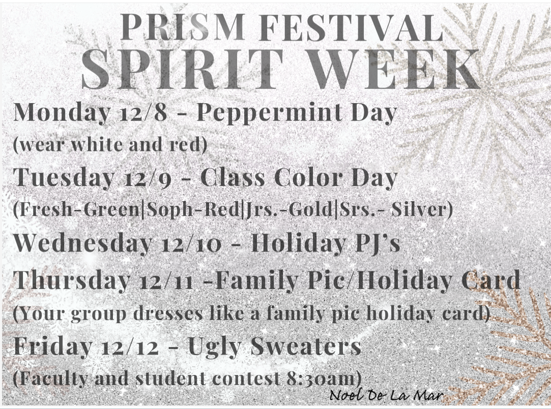 En reconocimiento al Festival Prism y para celebrar las inminentes vacaciones de invierno, el Consejo Estudiantil de EAHS ha colaborado con el programa de Banda para traer a la comunidad la SEMANA DEL ESPÍRITU NAVIDEÑO de 2025. La Semana del Espíritu culminará con la presentación de Prism el 13 de diciembre. Se anima tanto al profesorado como al alumnado a participar, especialmente en el concurso de “suéteres feos” que se realizará el viernes a las 8:30 a. m. en el vestíbulo del auditorio. Se entregarán premios a los suéteres más feos.
