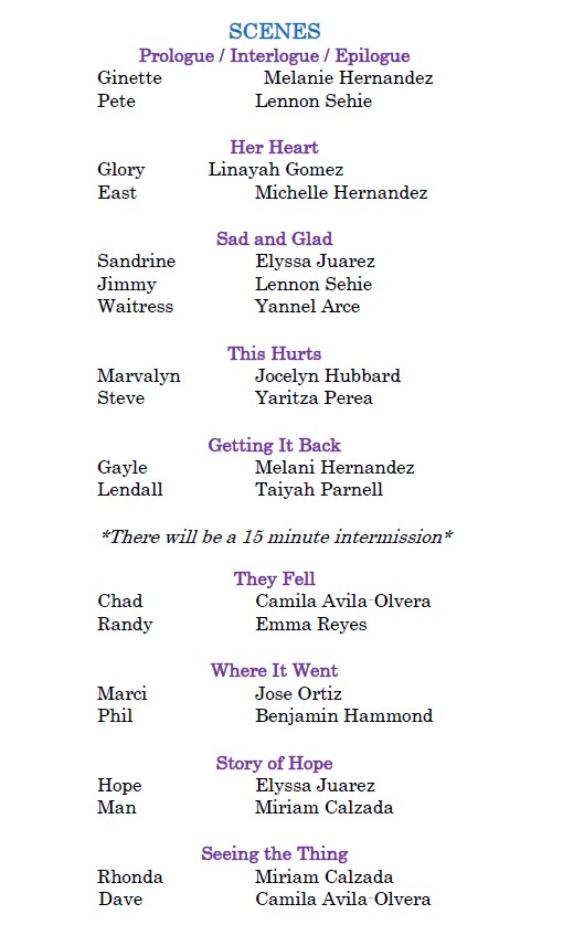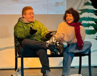 Staging any production at East Aurora High School is a tremendously collaborative effort. The cast consisted of performers from all grade levels. All technical aspects of the performances from design to execution were made possible by the contributions of student artists and technicians. Students from the East High Technical Theatre program contributed their efforts as did Ms. Sarah Felgenhauer’s Sculpture students. Ball concludes her Director’s notes, writing, “I couldn’t be prouder of this cast and crew for finding each other, finding this story, and inviting you to share in the magic of Almost, Maine. Thank you for supporting our program, our students, and the beautiful, messy, heartfelt act of being found.”