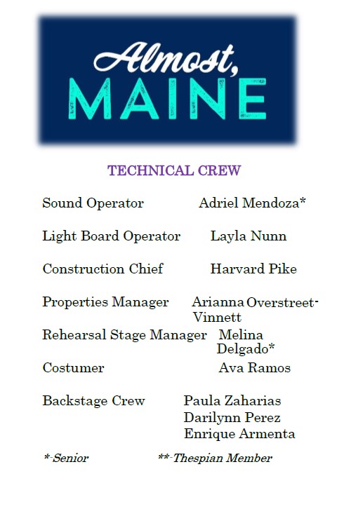 Presentar cualquier producción en la Preparatoria East Aurora es un esfuerzo tremendamente colaborativo. El elenco estuvo compuesto por artistas de todos los grados. Todos los aspectos técnicos de las representaciones, desde el diseño hasta la ejecución, fueron posibles gracias a las contribuciones de estudiantes artistas y técnicos. Los estudiantes del programa de Teatro Técnico de East High contribuyeron con sus esfuerzos, al igual que los estudiantes de Escultura de la Sra. Sarah Felgenhauer. Ball concluye sus notas de la directora escribiendo: «Estoy sumamente orgullosa de este elenco y equipo por encontrarse, descubrir esta historia e invitarlos a compartir la magia de Almost, Maine. Gracias por apoyar nuestro programa, a nuestros estudiantes y el hermoso, complejo y emotivo acto de ser encontrados».