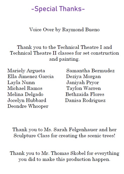 La inclusión de nueve obras cortas, generalmente con dos personajes distintos cada una, dentro del marco general de la producción, brindó muchas oportunidades para los actores de Tomcat. No solo hubo más papeles en general, sino también más oportunidades para que los actores de East Aurora se excedieran en sus capacidades interpretando múltiples papeles a lo largo de una función. La Sra. Karen Ball, profesora de Teatro de East Aurora, tuvo el honor de seleccionar y dirigir esta producción de Almost, Maine. Ball, quien ha sido una importante defensora de las Artes Dramáticas, tanto en el distrito como en la preparatoria, está en su primer año como instructora oficial de teatro principal en EAHS. En sus notas como directora, Ball escribe: «Esta producción se convirtió en una maravillosa lección de creatividad y valentía. Nuestro pequeño pero poderoso elenco interpretó múltiples personajes, cambió de escena e identidad, y descubrió el humor y la emoción que recorren este mosaico de historias de amor. Ver a estos estudiantes esforzarse al máximo —para encarnar la piel de otra persona (¡a veces literalmente!)— ha sido un recordatorio de la verdadera función del teatro: la conexión, el descubrimiento y la alegría de ser encontrado».